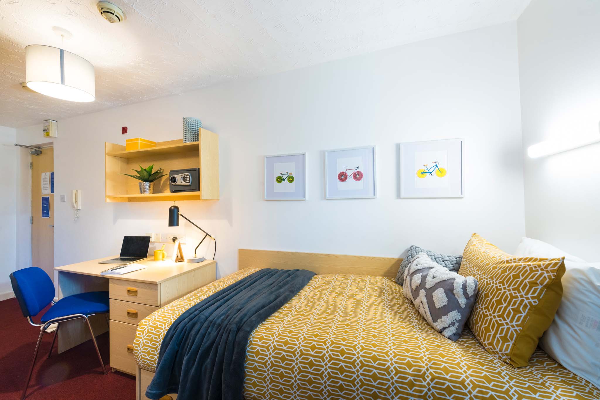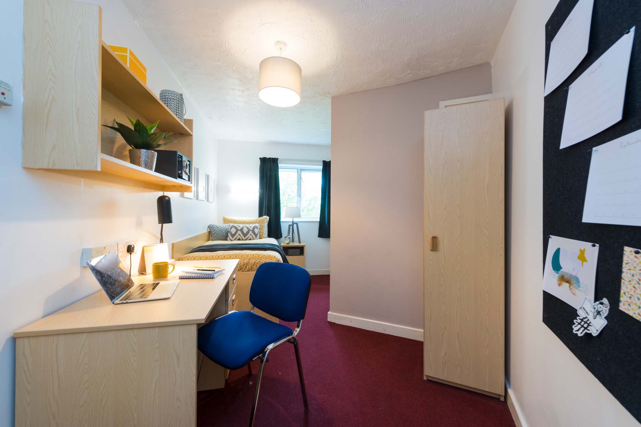 Cada habitación de estudiante tiene una cama, un armario, un escritorio y un montón de espacio para almacenar debajo de la cama y cajones.